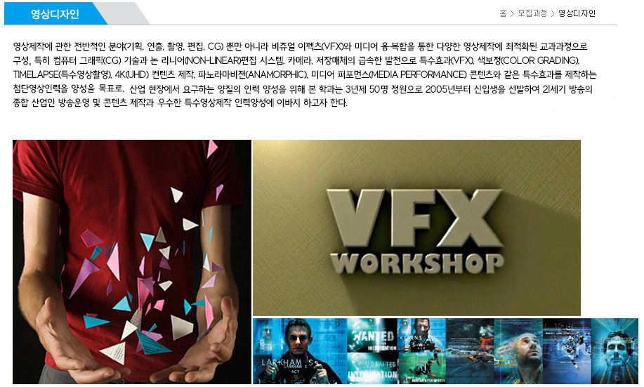 영상디자인전공은 인문/사회/과학/공학예술 등 인접 분야와 유기적이고, 상호작용적인 관계를 가지고 있다. 영화와 비디오를 위시한 전통적인 영상.방송뿐만 아니라 디지털 기술의 진보에 대한 정보, 통신 기술의 발달에 힘입어 영상시각디자인의 영역은 점차 늘어나고 있다. 또한, 기존의 디자인 분야와는 차별화되는 상호작용적인 매체를 기반으로 하는 첨담 디자인 분야이다. 영상과 멀티미디어 분야를 통합하는 분야로서 최신 컴퓨터 기술을 기반으로 전자, 인터렉티브 미디어, 인터페이스 디자인, 멀티미디어콘텐츠 디자인, 컴퓨터그래픽스의 기술과 연계하여 급속하게 변화해 가는 새로운 디자인 세계를 탐구하고, 실무에 필요한 전문적이고도 종합적인 디자인으로 앞으로 전개될 다양한 분야에 대한 기능성이 활짝 열려 있다.
